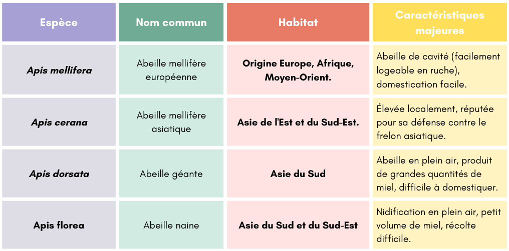 Il est essentiel de comprendre qu’Apis mellifera n’est qu’une des nombreuses espèces au sein du genre Apis. On dénombre une dizaine d’espèces différentes d’abeilles à miel dans le monde, principalement en Asie.